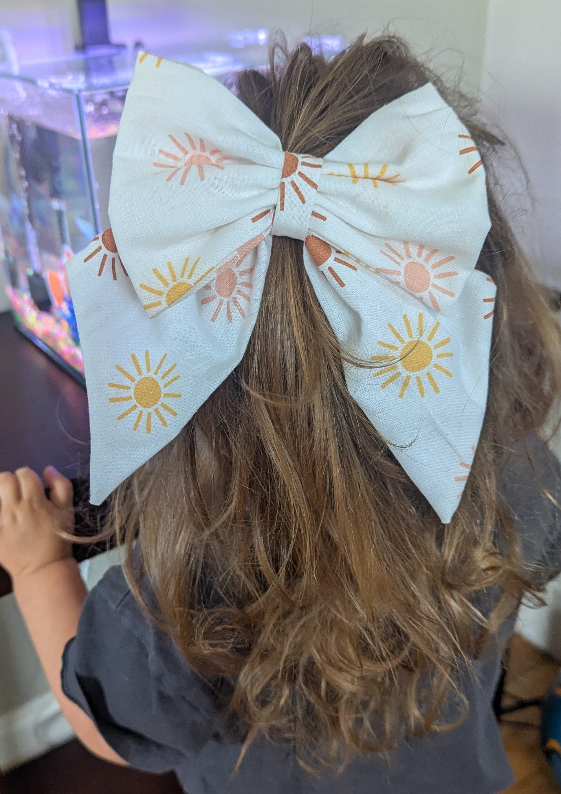This medium-sized fabric bow features a sunny design, perfect for adding a pop of color to any outfit. The alligator clip ensures secure placement, making it a convenient and stylish accessory. Add a touch of sunshine to your day with this charming bow.