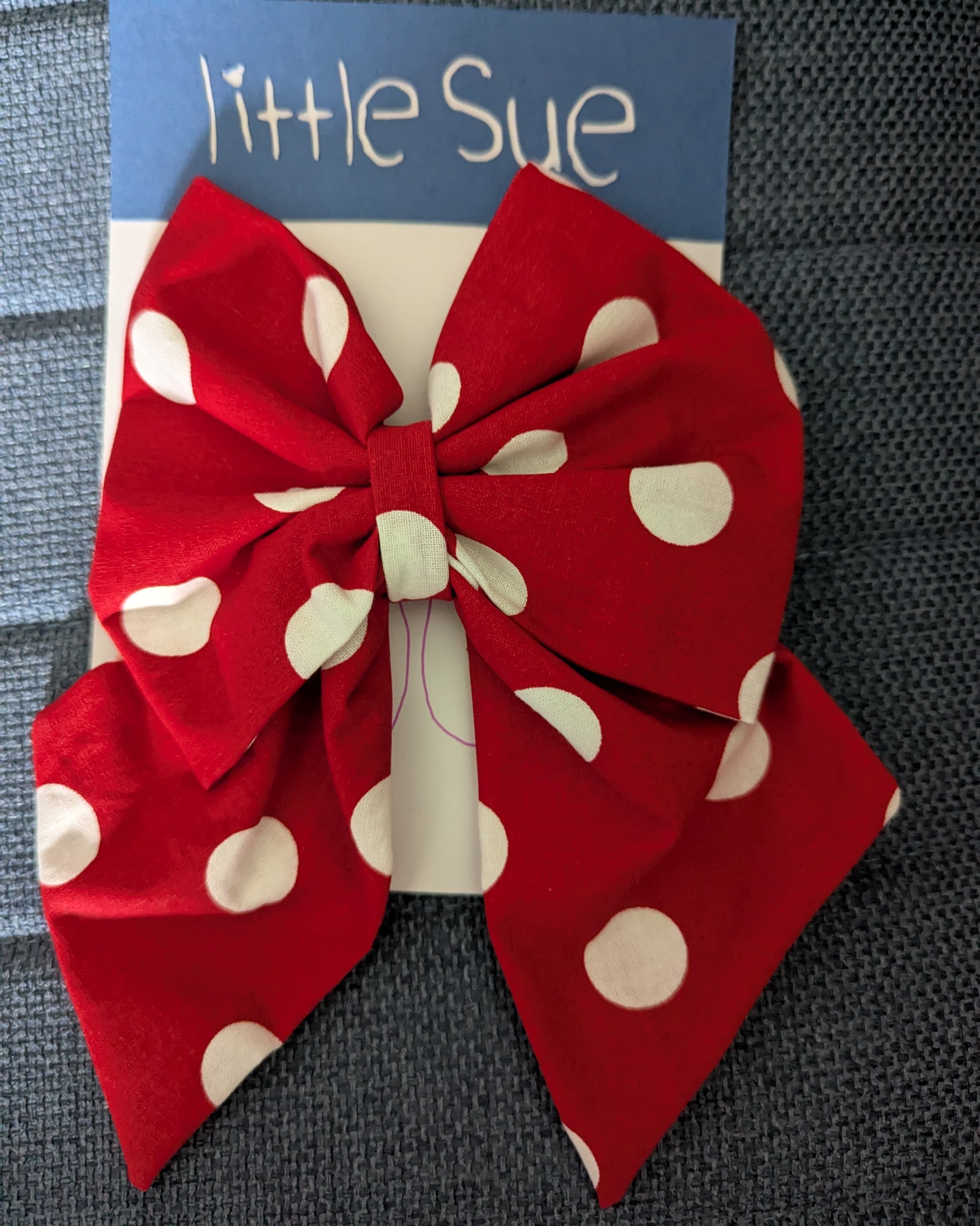 This large red bow with white dots is the perfect addition to any outfit. Made from high-quality fabric, it features a secure alligator clip to keep it in place. Add a touch of charm and style with this beautifully designed bow that will make you stand out everywhere you go.