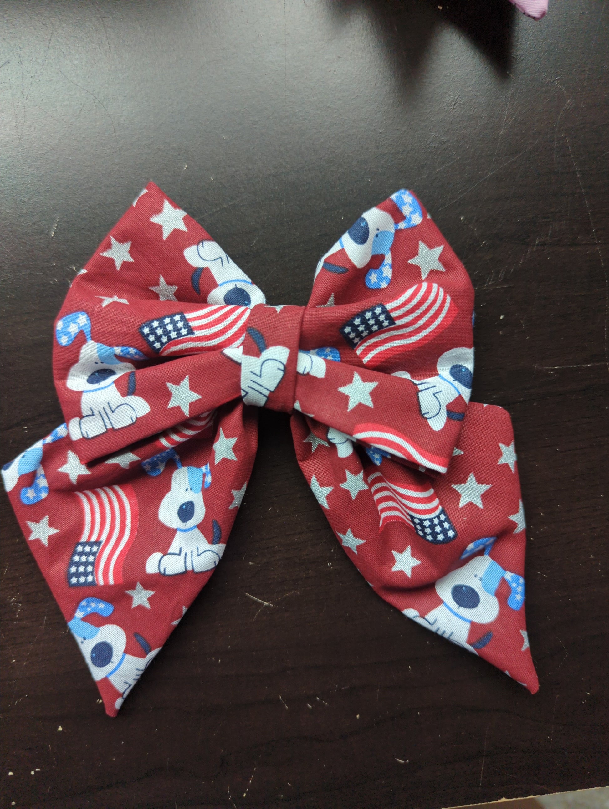 This medium-sized Fourth of July bow is the perfect accessory for any patriotic celebration. The red fabric is adorned with American flags, patriotic puppies, and stars, making it a festive addition to any outfit. It comes with a secure alligator clip, ensuring it stays in place all day long. Show off your American pride with this stylish bow.